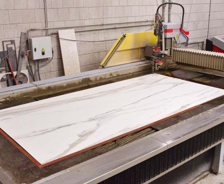 Dankzij de nauwkeurige sneden van de waterstraalmachine kan zelfs de adering in het materiaal bijna naadloos om de hoeken worden geleid.